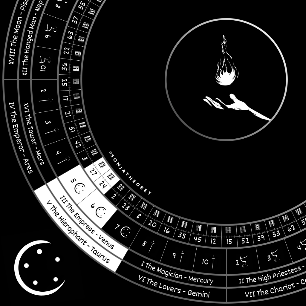 Today the moon is in Hexagram 27, moving in to 24 later this evening. Hexagram 27, is translated as “Nourishment,” “Corner of the Mouth,” and in at least one translation, “Jaws.”
